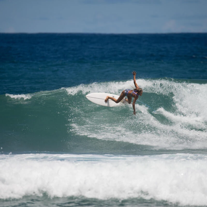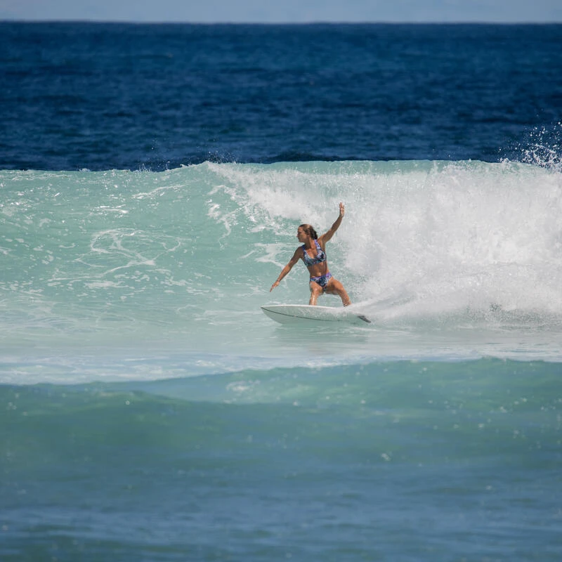 Le surf est ton sport passion et tu le pratiques très régulièrement en eaux chaudes. Lors des sessions, tu rames jusqu’au line up, en faisant le canard ou la tortue, tout dépend si tu es en shortboard ou longboard. Tu surfes des vagues de plus d’un mètre et tu sais faire des manœuvres. Tu chutes souvent et tu es habituée à être secouée sous l’eau. Tu souhaites que ton maillot reste en place à chacun de tes mouvement et qu’il ne te gène pas lors de la rame.