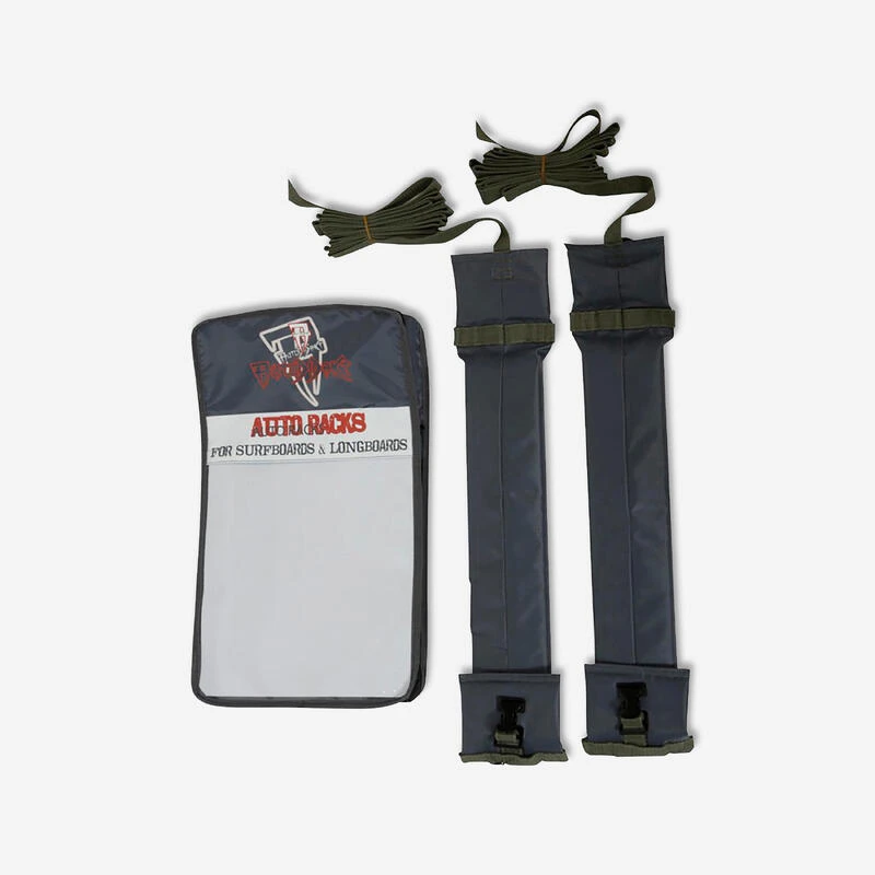 Les mousses se posent à plat sur le toit du véhicule, on passe ensuite la sangle à l’avant par les 2 portières ouvertes, la sangle passant derrière la tète du conducteur et du passager de devant. Idem pour la sangle arrière. Passer dans la boucle, serrer puis avec le reste de sangle on attache les planches sur le toit. Ne pas monter avec les portières fermées en passant par les vitres ouvertes car vous ne pourrez plus ouvrir les portières.