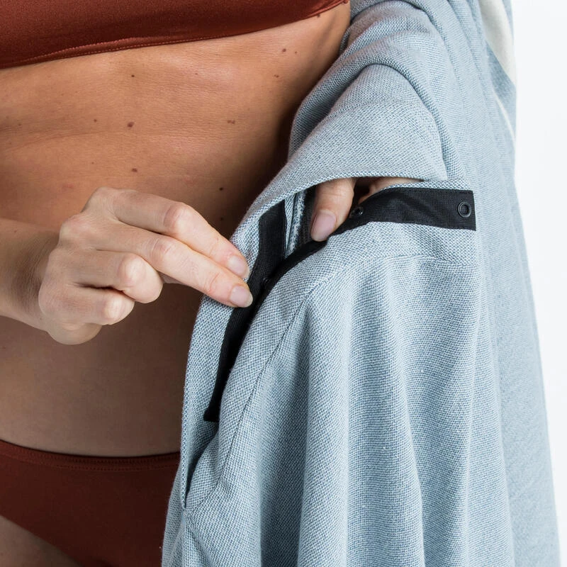Nos concepteurs surfeurs ont développé ce produit pour se sécher, se changer, et se reposer avant et après vos activités nautiques estivales. Convient à tous!Serviette Fouta très grande (190 x 190 cm). Ultra compacte une fois pliée. Une serviette 2 en 1 qui permet de se changer facilement, en mode poncho !