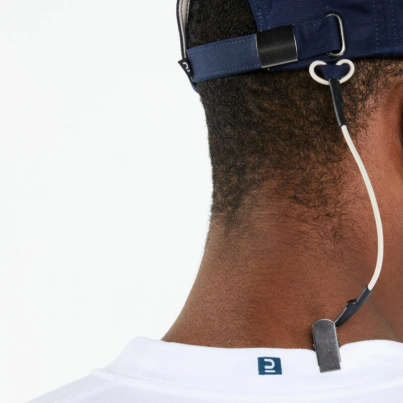 Un cordon élastique permet d’attacher la caquette à son t-shirt pour éviter de la perdre s’il y a un coup de vent. Ce cordon est amovible