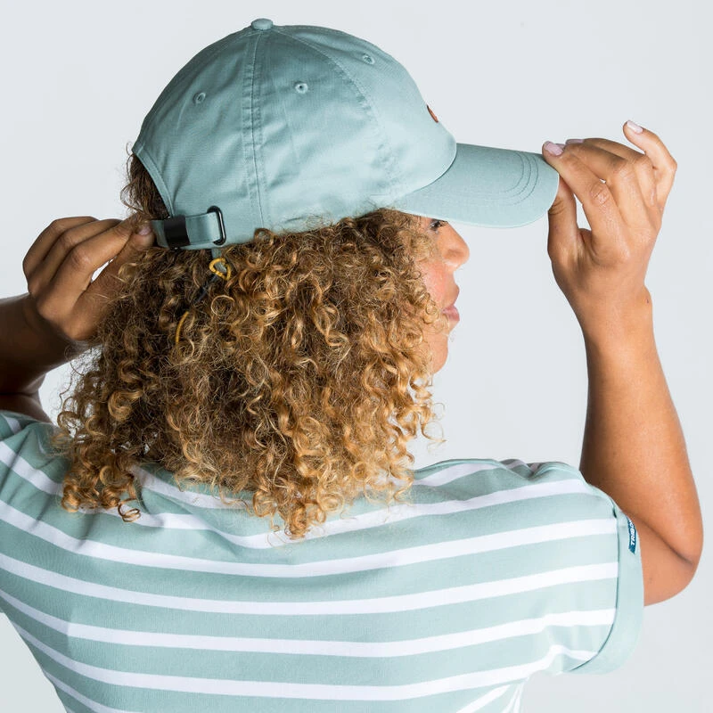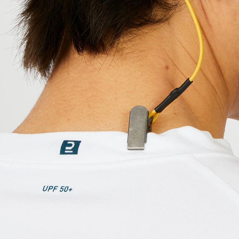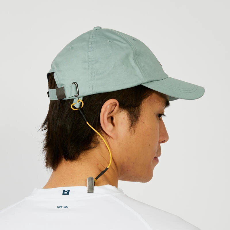 Un cordon élastique permet d’attacher la caquette à son t-shirt pour éviter de la perdre s’il y a un coup de vent. Ce cordon est amovible