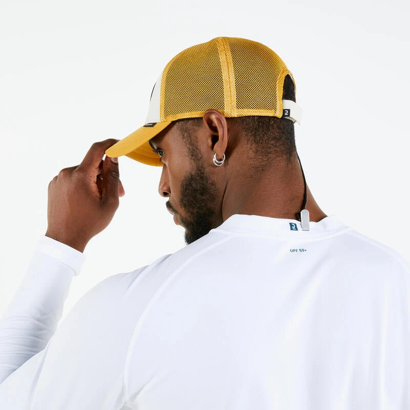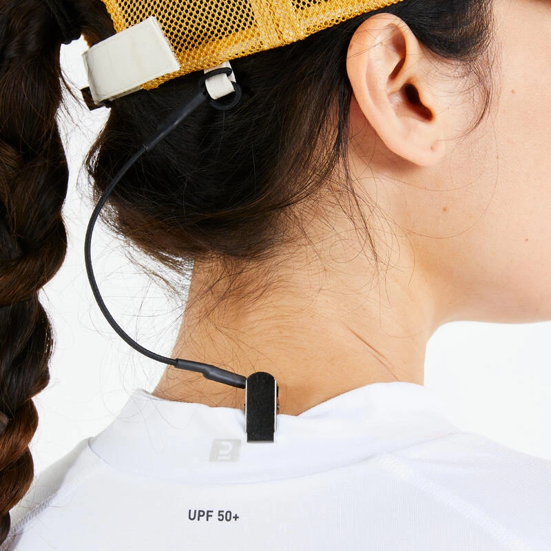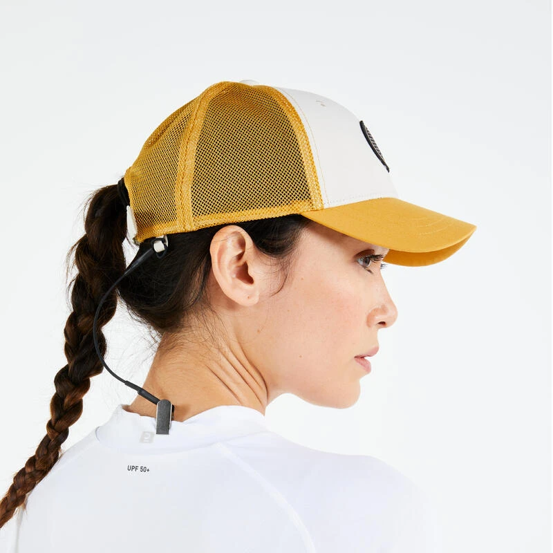 Un cordon élastique permet d’attacher la casquette à son t-shirt pour éviter de la perdre s’il y a un coup de vent. Ce cordon est amovible